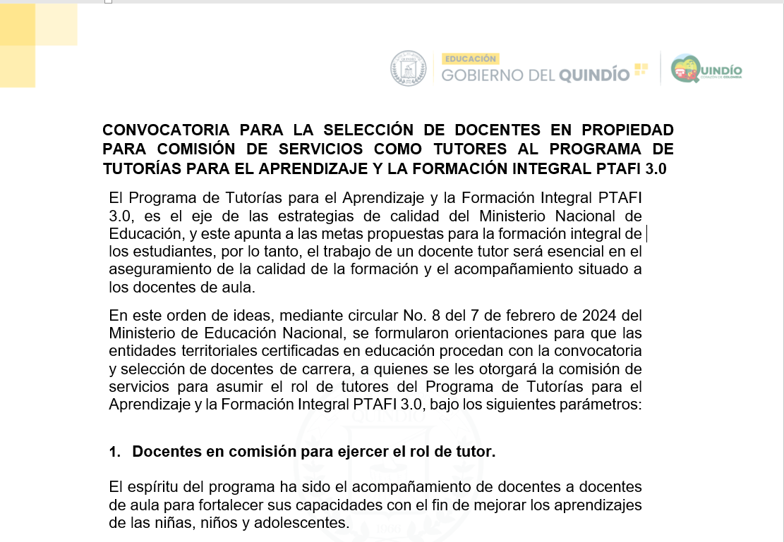 En este orden de ideas, mediante circular No. 8 del 7 de febrero de 2024 del Ministerio de Educación Nacional, se formularon orientaciones para que las entidades territoriales certificadas en educación procedan con la convocatoria y selección de docentes de carrera, a quienes se les otorgará la comisión de servicios para asumir el rol de tutores del Programa de Tutorías para el Aprendizaje y la Formación Integral PTAFI 3.0.